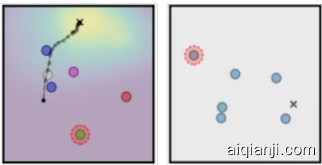 Figure 4: Outcomes of generation (left) and identification (right) for the concept of being farthest to cross-shaped entity. Path in left image is the optimization trajectory for the cross entity with the energy heatmap is overlaid.