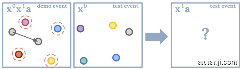 To learn concepts from experience grounded in events, we pose a few-shot prediction task. Given a few demonstration examples $X^{\mathrm{{deino}}}$ containing tuples $(\mathbf{x},\mathbf{a})$ and initial state $\mathbf{x}^{0}$ for a new event in $X^{\mathrm{train}}$ , the task is to predict attention a and the future state trajectory $\mathbf{x}^{1:T}$ of the new event. The new event may contain a different configuration or number of entities, so it is not possible to directly transfer attention mask, for instance. To simplify notation, we consider prediction of only one future state $\mathbf{x}^{1}$ , although predicting more states is straightforward. The procedure is depicted in Figure 2.