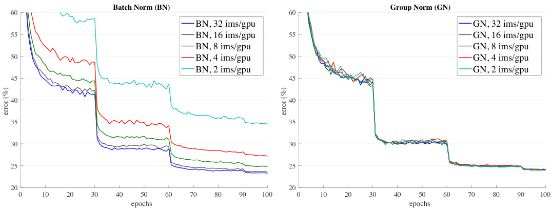 Figure 5. Sensitivity to batch sizes: ResNet-50’s validation error of BN (left) and GN (right) trained with 32, 16, 8, 4, and 2 images/GPU.