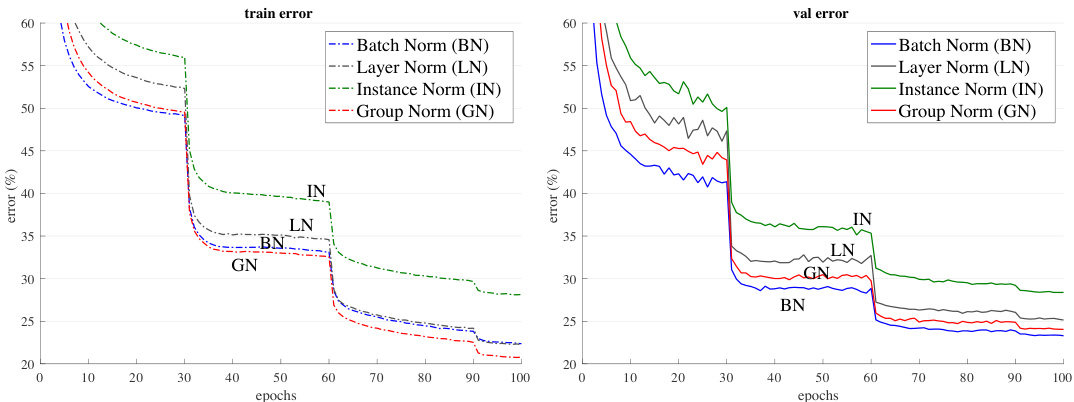 特征归一化方法对比。我们首先在每GPU 32张图像的常规批量大小下进行实验 [26, 20]。BN (Batch Normalization) 在该场景下表现良好,因此这是一个强有力的对比基线。图4展示了错误率曲线,表1列出了最终结果。