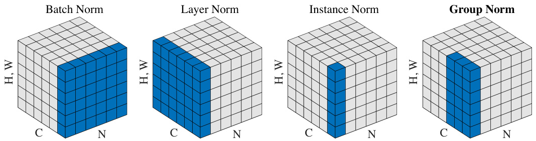 Figure 2. Normalization methods. Each subplot shows a feature map tensor, with  $N$   as the batch axis,  $C$   as the channel axis, and   $(H,W)$  as the spatial axes. The pixels in blue are normalized by the same mean and variance, computed by aggregating the values of these pixels.