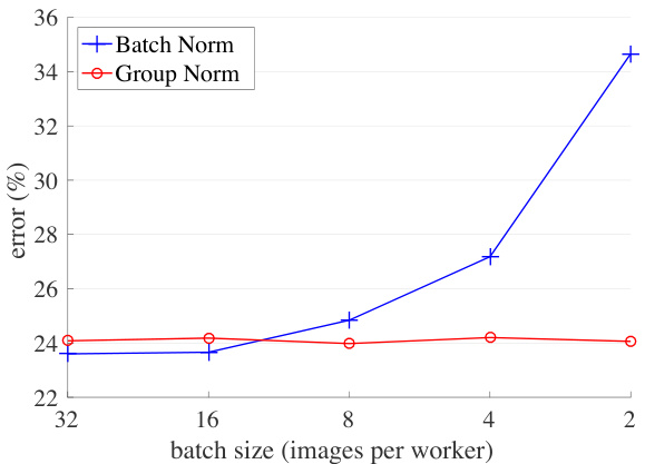 Figure 5 (left) shows that BN’s error becomes considerably higher with small batch sizes. GN’s behavior is more stable and insensitive to the batch size. Actually, Figure 5 (right) shows that GN has very similar curves (subject to random variations) across a wide range of batch sizes from 32 to 2. In the case of a batch size of 2, GN has $10.6%$ lower error rate than its BN counterpart $(24.1%\nu s.34.7%)$ .