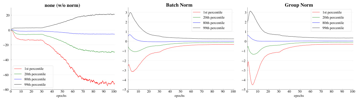 Figure 6. Evolution of feature distributions of  $\mathrm{conv_{5,3}}$  ’s output (before normalization and ReLU) from VGG-16, shown as the  {1,20,80,99}   percentile of responses. The table on the right shows the ImageNet validation error  $(%)$  . Models are trained with 32 images/GPU.