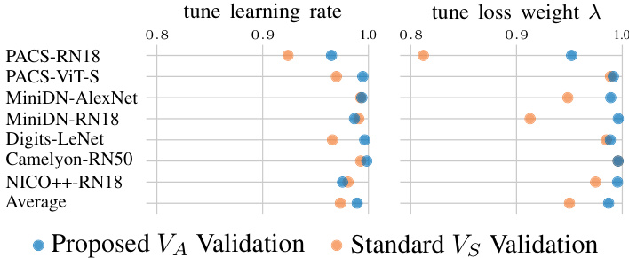 我们进行了超参数调优实验,分别独立调整学习率和损失权重$\lambda$。图7展示了两种验证流程所选模型的性能表现。与$V_{S}$相比,$V_{A}$在测试准确率上的绝对(相对)平均提升分别为:学习率调优带来1.0$(1.6%)$的提升,损失权重调优带来2.3$(3.9%)$的提升。虽然$V_{A}$在两个调优过程中都筛选出性能更优的模型,但在调整与领域泛化相关的超参数$\lambda$时观察到更显著的增益。另一方面,与学习过程相关的超参数(即学习率)的影响,预期也会反映在来自训练分布的验证集上。即便在这种对$V_{S}$有利的场景中,也没有证据支持使用$V_{S}$而非我们提出的$V_{A}$方案。
