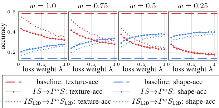 Figure 8. Shape-texture bias: The accuracy of different variants is evaluated on the cue conflict stimuli test set based on shape or test labels. Loss weight  $\lambda$   and exponent  $w$   are the ways to control the influence of shape during training and testing, respectively, with  $\lambda=