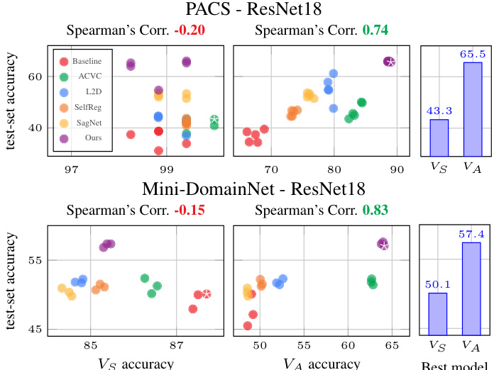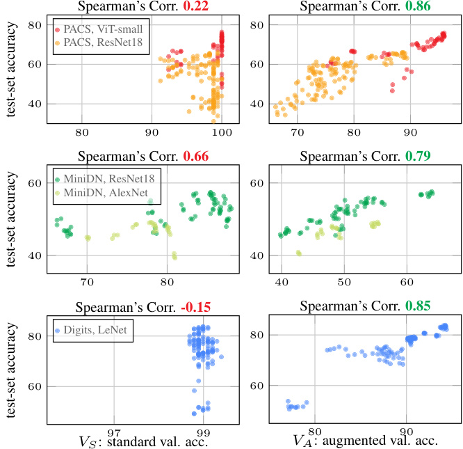 Correlation of validation and test performance. The models of the proposed variants are evaluated on the standard validation set $V_{S}$ , the proposed augmented validation $V_{A}$ , and the test data. To visualize the reliability of predictions based on validation set performance, scatter plots comparing validation versus test performance are shown in Figure 4. Performance on the proposed $V_{A}$ shows a much higher correlation with the test performance. The performance saturation on $V_{S}$ for simple tasks like PACS is a major issue.