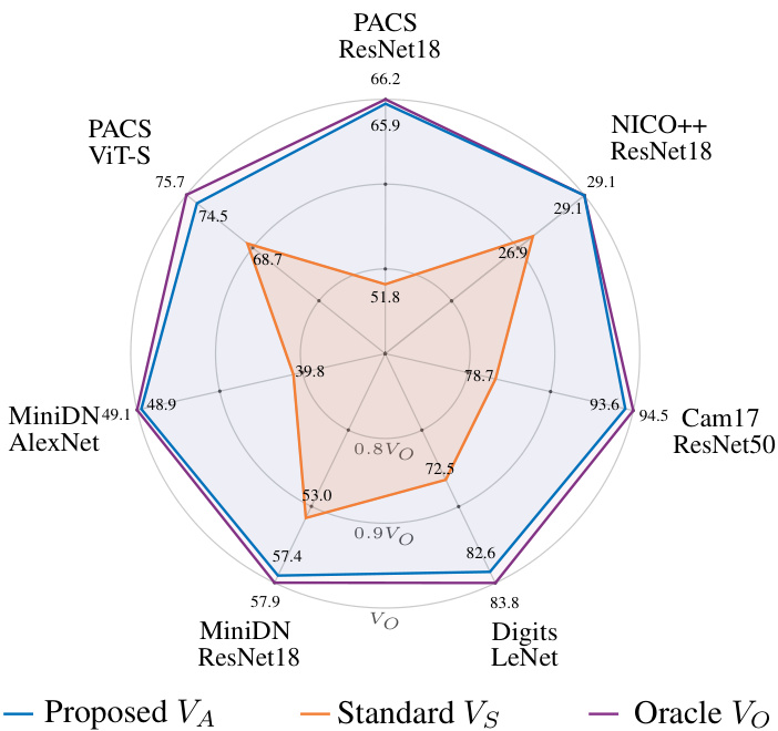 Figure 1. Test accuracy comparison of different validation methods across seven dataset-backbone configurations. Each axis ranges from  $70%$   to  $100%$   of the oracle validation  $V_{O}$   that assumes access to the test set. The proposed augmented validation   $V_{A}$   achieves over  $98%$   of the oracle performance on average, representing a  $\mathbf{15.4%}$   relevant improvement over the standard validation  $V_{S}$  . For each dataset, the model is chosen from a pool, with 4, 500 trained models across all pools.
