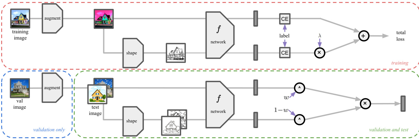 Figure 3. Overview of the training, validation, and testing pipeline. Training images are augmented with basic and a sub-set of extra augmentations. The shape information, encoded as binary thin edges of the augmented image, generates an additional training example. The contribution of the two losses, image and shape-based, is weighed by a parameter λ. In validation, extra augmentations that were not included in the training are used to synthesize unseen distributions. The shape information is optionally exploited in testing and in the validation phase. The final prediction is obtained by ensembling the image and the shape-based predictions, weighted by a parameter   $w$  .