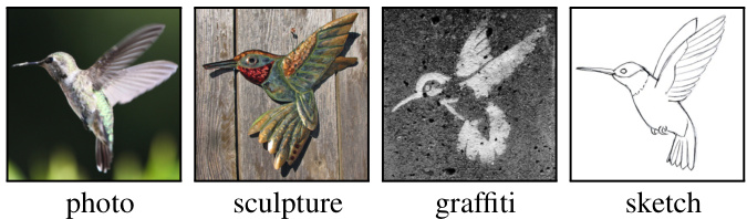 Figure 2. “Hummingbird” in four different domains. The domain generalization task tacitly assumes domains that share informative, human-understandable features, such as texture, shape, or semantics. Therefore, the unseen domains are expected to be humanrecognizable. Images from ImageNet [14] and ImageNet-R [27]