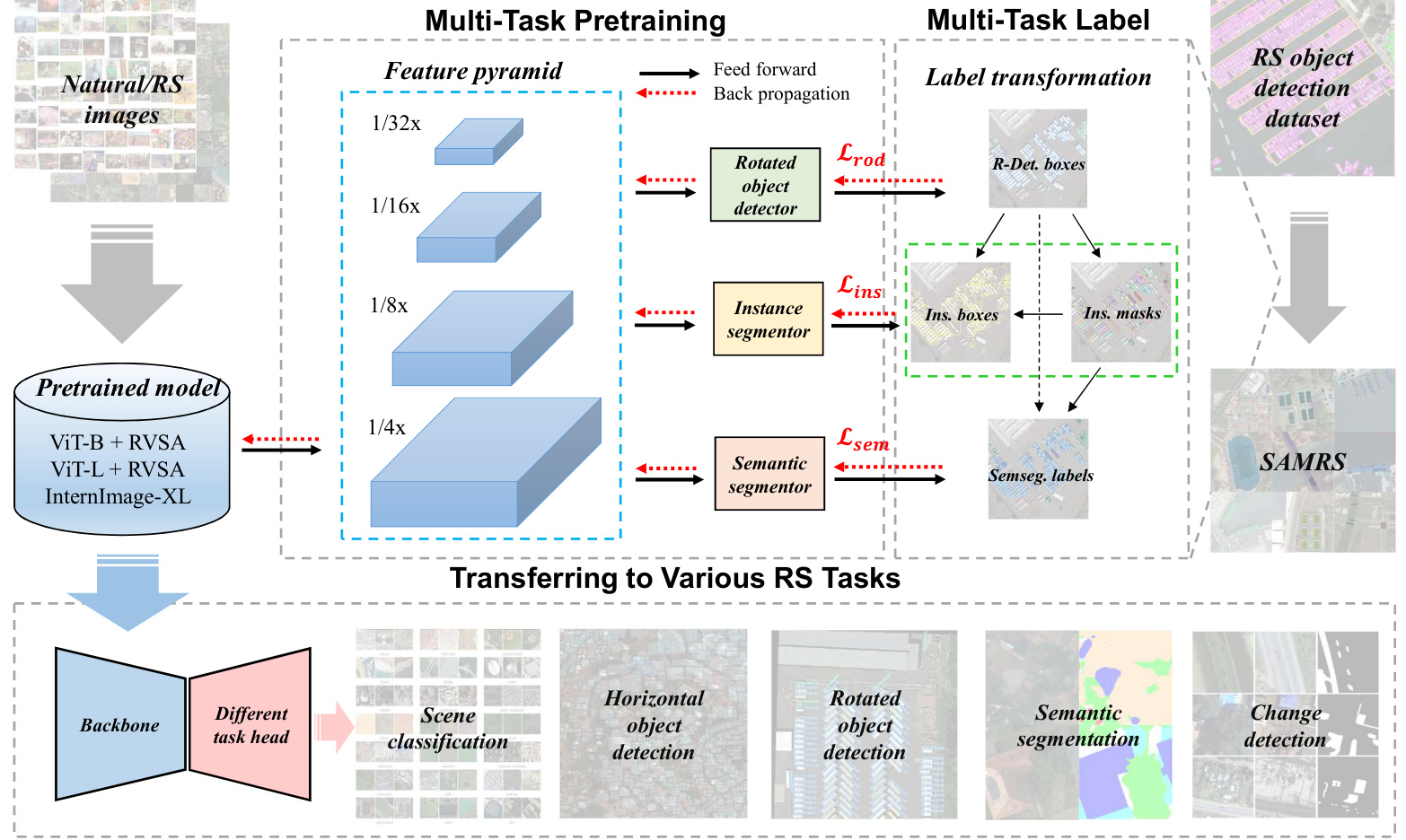 Applying multi-task learning to enhance the RS foundation model is an intuitive idea. Li et al. [64] introduced multitask SSL representation learning, combining image inpainting, transform prediction, and contrast learning to boost semantic segmentation performance in RS images. However, it was limited to finetuning a pretrained model solely on semantic segmentation tasks, constrained by model size and pre training dataset capacity. RSCoTr [65] constructs a multi-task learning framework to simultaneously achieve classification, segmentation, and detection tasks. Unfortunately, the network can only be optimized by one task in each iteration during training due to lacking of multi-label datasets. The aspiration to consolidate multiple tasks into a single model has been a longstanding pursuit [15], [17], [42], [58], [66]–[75], aligning with the original goals of the foundation model exploration. Bastani et al. [59] devised a multi-task model by integrating Swin-Base [57] with seven heads from existing networks (e.g., FasterRCNN [76] and UNet [77]), facilitating training on the multitask annotated Satlas dataset. However, their approach lacked incorporation of typical RS rotated object tasks, focusing solely on transferring the model to RS classification datasets. Inspired by these pioneering efforts, this paper constructs a unified multi-task pre training framework that supports multiple datasets, where the sample in each dataset simultaneously possesses multi-task labels, which are uniformly processed in a data loader pipeline. During the training, the model can be simultaneously optimized through multiple tasks when in each iteration. Based on this framework, we pretrain RS foundation models with over 300M parameters, encompassing semantic segmentation, instance segmentation, and rotated object detection tasks using the SAMRS dataset. After pre training, the backbone network is further finetuned on various RS downstream tasks.