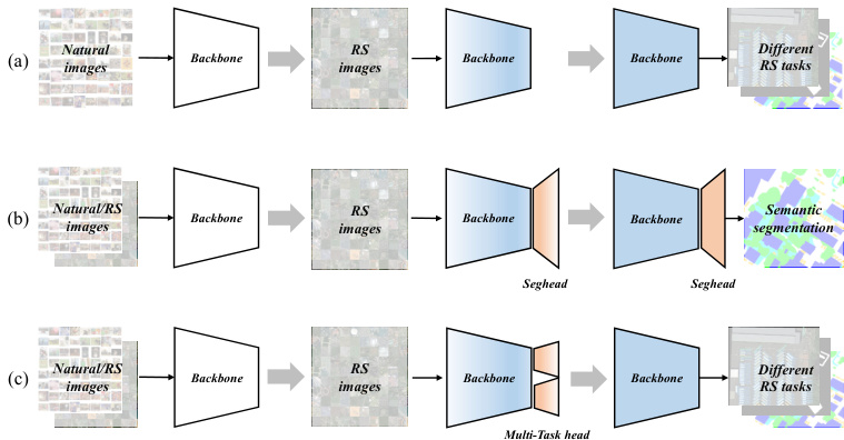 Fig. 1. Comparison of various pre training methods. (a) [11], [12] sequentially pretrains a foundational model on both natural and RS images. (b) [13] employs a two-stage pre training strategy to initialize task-specific decoders (e.g., segmentation) using existing foundational models pretrained on either natural or RS images, preserving the decoder during subsequent finetuning. We extend (b) by incorporating multi-task decoders to enhance the representation capacity of the foundational model, facilitating easy transfer ability across diverse tasks during finetuning, as depicted in (c).
