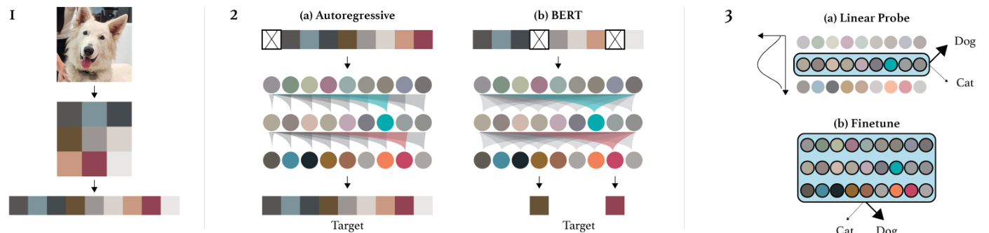 图 1: 方法概述。首先,我们通过将原始图像调整为低分辨率并重塑为一维序列进行预处理。然后选择两种预训练目标之一:自回归的下一个像素预测或掩码像素预测。最后,通过线性探测或微调评估这些目标学习到的表征。