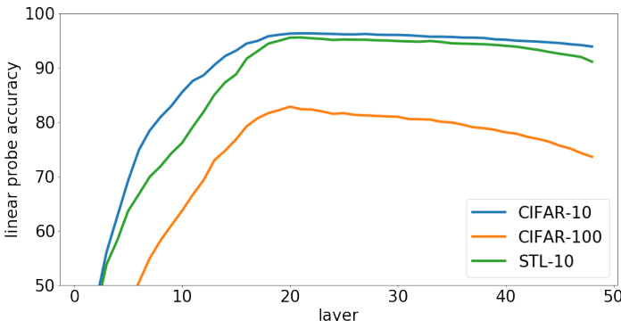 Figure 2. Representation quality depends on the layer from which we extract features. In contrast with supervised models, the best representations for these generative models lie in the middle of the network. We plot this unimodal dependence on depth by showing linear probes for iGPT-L on CIFAR-10, CIFAR-100, and STL-10.