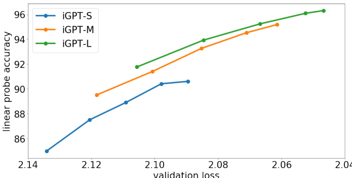 Figure 3. Plot of representation quality as a function of validation generative loss. Each line tracks a model throughout generative pre-training: the dotted markers denote checkpoints at steps 65K, 131K, 262K, 524K, and 1000K. The positive slope suggests a link between improved generative performance and improved representation quality. Larger models produce better representations than smaller ones both at the end of training and at the same value of validation loss. iGPT-XL is not shown since it was trained on a different dataset.