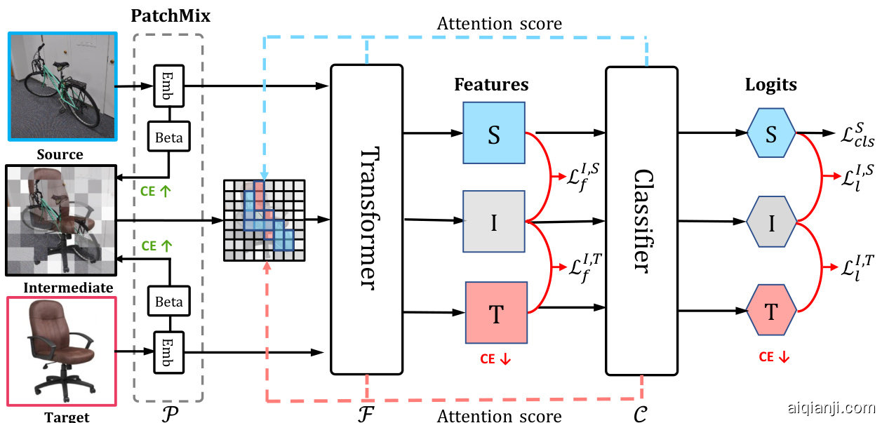 概述。图3展示了我们提出的PMTrans框架,该框架由ViT编码器、分类器和PatchMix模块组成。PatchMix模块用于最大化中间域与源/目标域之间的交叉熵(CE),相反,我们提出了特征空间和标签空间中的两种半监督混合损失以最小化CE。最终,包含特征提取器、分类器和PatchMix模块的三方博弈通过最小化和最大化CE来实现源域与目标域的分布对齐。