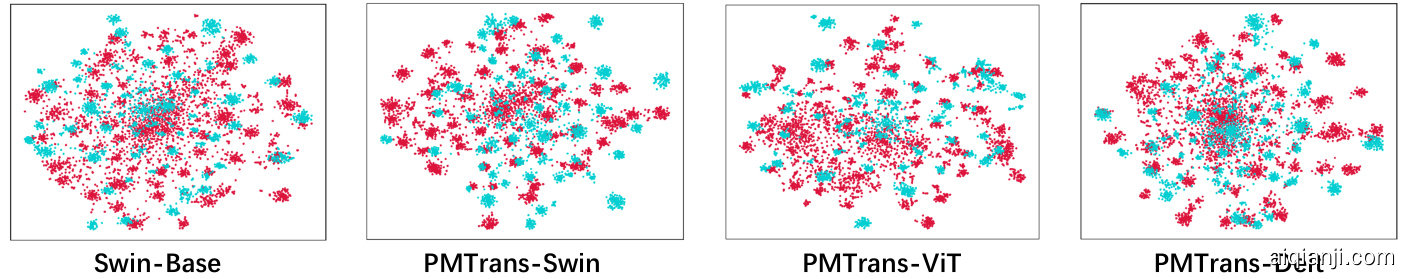 Visualization. In Fig. 5, we visualize the features learned by Swin-based, PMTrans-Swin, PMTrans-ViT, and PMTransDeit on task mathrm{A}tomathrm{C} from the Office-Home dataset via the t-SNE [11]. Compared with Swin-based and PMTrans-Swin, our PMTrans model can better align the two domains by constructing the intermediate domain to bridge them. Moreover, comparisons between PMTrans with different transformer backbones reveal that PMTrans works successfully with different backbones on UDA tasks. Due to the page limit, more experiments and analyses can be found in the suppl. material.