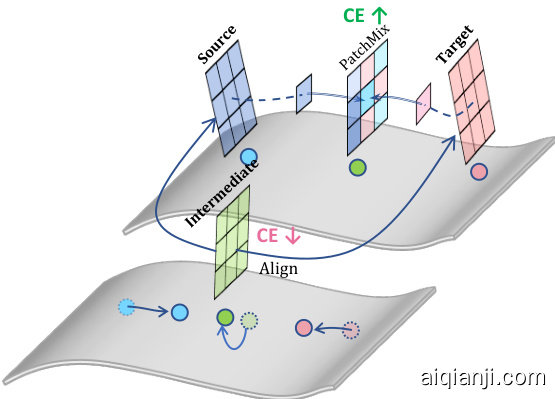 图 2: PMTrans通过新颖的PatchMix模块构建中间域(绿色区块),学习从源域(蓝色区块)和目标域(粉色区块)采样区块。PatchMix试图最大化中间域与源/目标域之间的CE (uparrow),而特征提取器和分类器则试图最小化CE (downarrow)以实现域对齐。