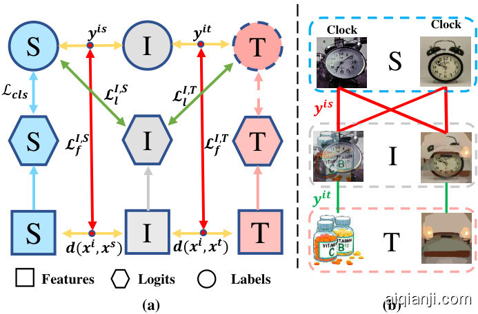 图 4: (a) 两种提出的半监督损失示意图。(b) 标签相似度 {pmb y}^{i s} 和 {pmb y}^{i t}。建议彩色查看。