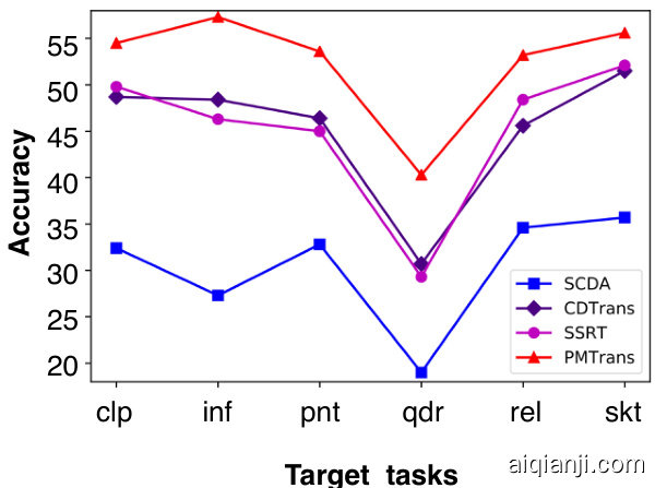 PMTrans的平均准确率达到27.0%,而基于ViT的SSRT和CDTrans分别仅达到13.7%和1%。DomainNet数据集上的对比实验表明,我们的PMTrans在具有挑战性的无监督域适应(UDA)问题上展现出最佳的泛化能力。