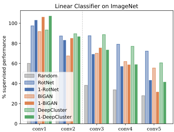 我们证明这些结论适用于三种不同的自监督方法:BiGAN (Donahue et al., 2017)、RotNet (Gidaris et al., 2018) 和 Deep Cluster (Caron et al., 2018),它们代表了当前流行的技术谱系。我们发现性能随数据量的变化因方法而异,但这三种方法确实都能利用单张图像近乎"完美"地学习深度网络的前几层。