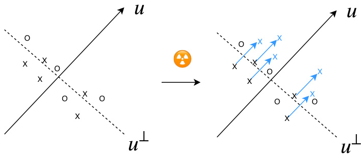 图 2: 高维空间中本方法的示意图。在高维情况下,区分类别的线性分类器几乎必然与向量 $u$ 正交。我们的方法将属于某类别的点沿 $u$ 方向平移,从而使线性分类器与 $u$ 方向对齐。