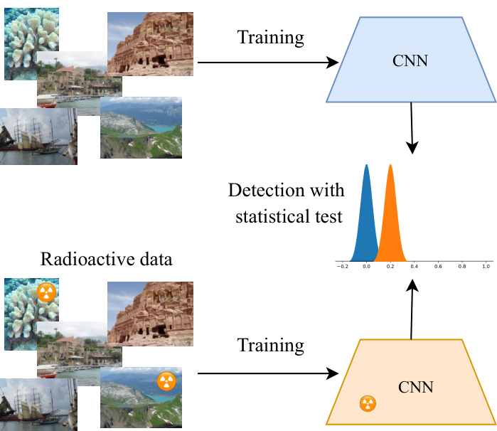 Let us assume that this data, as well as other collected data, is used to train a convolutional neural network (convnet). After training, the model is inspected to assess the use of radioactive data. The convnet is accessed either (1) explicitly when the model and corresponding weights are available (white-box setting), or (2) implicitly if only the decision scores are accessible (black-box setting). From that information, we answer the question of whether any radioactive data has been used to train the model, or if only vanilla data was used. We want to provide a statistical guarantee with the answer, in the form of a $p$ -value.