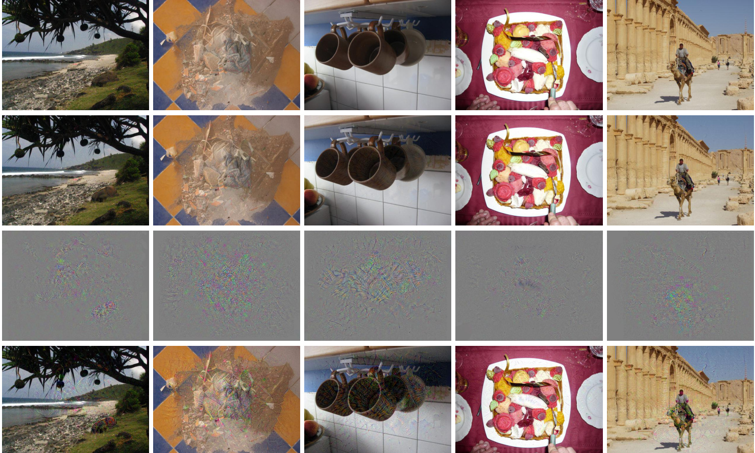 Figure 3. Radioactive images from Holidays (Jégou et al., 2008) with random crop and PSNR  $=$  42dB. First row: original image. Second row: image with a radioactive mark. Third row: visualisation of the mark amplified with a  $\times5$   factor. Fourth row: We exaggerate the mark by a factor  $\times5$  , which means a 14dB amplification of the additive noise, down to PSNR  $\underline{{\underline{{\mathbf{\Pi}}}}}$  28dB so that the modification become obvious w.r.t. the original image.
