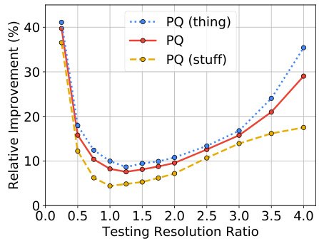 Scale Stress Test: In order to verify that our model learns long range interactions, we perform a scale stress test besides standard testing. In the stress test, we train Panoptic-DeepLab (X-71) and our Axial-DeepLab-L with the standard setting, but test them on out-of-distribution resolutions (i.e., resize the input to different resolutions). Fig. 4 summarizes our relative improvements over Panoptic-DeepLab on PQ, PQ (thing) and PQ (stuff). When tested on huge images, Axial-DeepLab shows large gain (30%), demonstrating that it encodes long range relations better than convolutions. Besides, Axial-DeepLab improves 40% on small images, showing that axial-attention is more robust to scale variations.