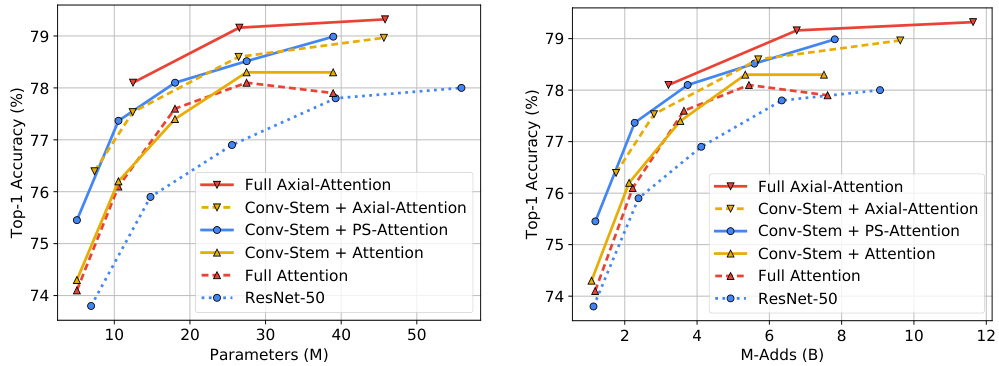 Fig. 3. Comparing parameters and M-Adds against accuracy on ImageNet classification. Our position-sensitive self-attention (Conv-Stem   $+$   PS-Attention) and axialattention (Conv-Stem  $+$   Axial-Attention) consistently outperform ResNet-50 [32,68] and attention models [68] (both Conv-Stem  $^+$   Attention, and Full Attention), across a range of network widths (i.e., different channels). Our Full Axial-Attention works the best in terms of both parameters and M-Adds