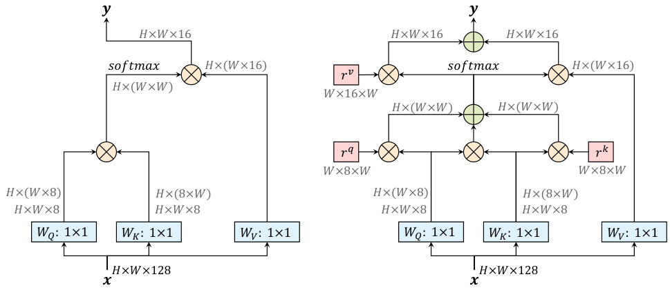 Fig. 1. A non-local block (left) vs. our position-sensitive axial-attention applied along the width-axis (right). “  $\bigotimes$  ” denotes matrix multiplication, and “  $\bigoplus$  ” denotes elementwise sum. The softmax is performed on the last axis. Blue boxes denote   $1\times1$   convolutions, and red boxes denote relative positional encoding. The channels   $d_{i n}=128$  ,  $d_{q}=8$  , and   $d_{o u t}=16$   is what we use in the first stage of ResNet after ‘stem’
