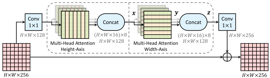 One axial-attention layer propagates information along one particular axis. To capture global information, we employ two axial-attention layers consecutively for the height-axis and width-axis, respectively. Both of the axial-attention layers adopt the multi-head attention mechanism, as described above.