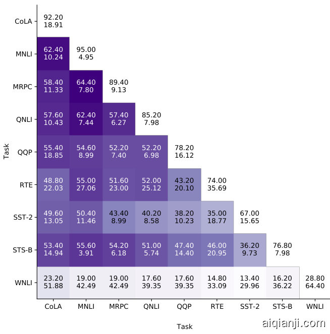 虽然"优质"子网络并不稳定,但这些子网络之间的重叠部分仍可用于刻画任务本身。我们将详细探索留待未来研究,但作为简要说明,图5展示了GLUE任务中"优质"子网络的两两重叠情况。