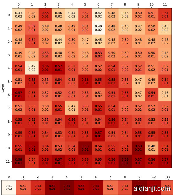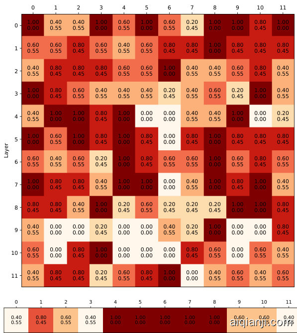 图 1: QNLI的"优质"子网络:自注意力头(顶部,$12\textbf{x}12$热力图)和MLP(底部,1x12热力图)共同剪枝。初始层从0开始。
