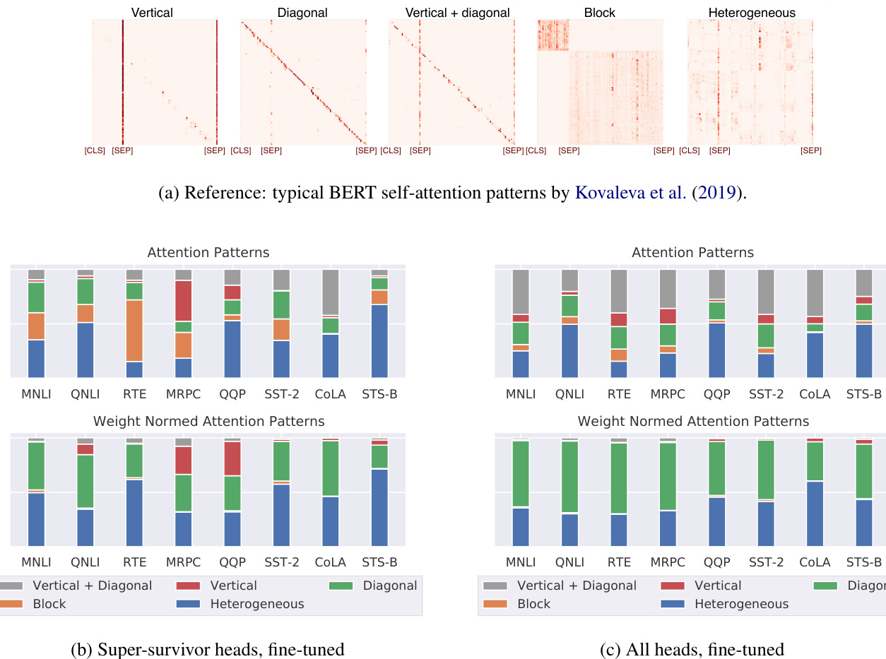 Our results suggest that the super-survivor heads do not preferentially encode non-trivial linguistic relations (heterogeneous pattern), in either raw or normed self-attention (Figure 4b). As compared to all 144 heads (Figure $4\mathrm{c}$ ) the “raw” attention patterns of super-survivors encode considerably more block and vertical attention types. Since norming reduces attention to special tokens, the proportion of diagonal patterns (i.e. attention to previous/next tokens) is increased at the cost of vertical+diagonal pattern. Interestingly, for 3 tasks, the super-survivor sub networks still heavily rely on the vertical pattern even after norming. The vertical pattern indicates a crucial role of the special tokens, and it is unclear why it seems to be less important for MNLI rather than QNLI, MRPC or QQP.