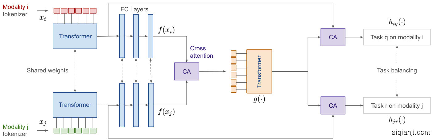 训练时,我们从所有可用模态中采样一对模态,然后为每个采样模态各采样一个任务。接着构建训练批次,每个采样任务各占一半。完成token化后,特征 x_{i},x_{j} 被传入第一个特征转换子网络得到 f(x_{i}),f(x_{j}) ,然后通过交叉注意力模块进行融合。融合后的特征输入网络第二部分 g(cdot) 。输出 hat{x}_{i j}=gcircmathcal{A}(f(x_{i}),f(x_{j})) (其中 mathcal{A}(cdot) 是交叉注意力函数)会再次与各自输入特征 x_{i},x_{j} 融合。这些特征 mathcal{A}(hat{x}_{i j},x_{i}),mathcal{A}(hat{x}_{i j},x_{j}) 随后被送入任务预测器 h_{i q} 和 h_{j r} ,分别获得模态 i,j 上任务 q,r 的最终预测。通过反向传播最小化当前批次的损失总和 ell_{i q}+ell_{j r} 。因此学习过程通过每次优化一对损失,随机最小化所有损失的总和来实现。