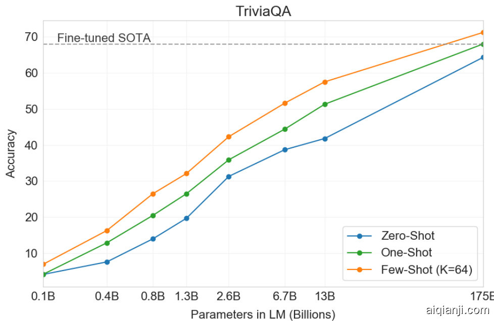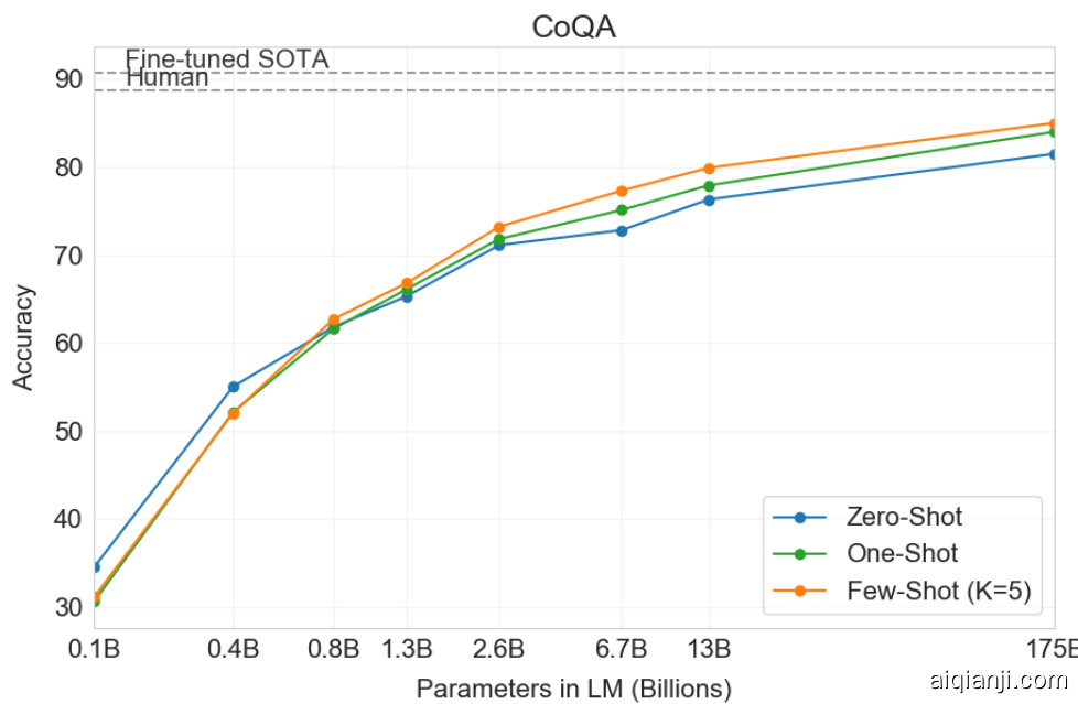 广泛而言,在NLP任务上,GPT-3在零样本和单样本设置中取得了令人瞩目的成果,在少样本设置下有时能与甚至偶尔超越当前最优水平(尽管当前最优模型多为经过微调的模型)。例如,GPT-3在CoQA任务中零样本设置下达到81.5 F1值,单样本设置下为84.0 F1值,少样本设置下为$85.0\mathrm{F}1$。同样地,在TriviaQA任务中,GPT-3零样本设置准确率为$64.3%$,单样本设置提升至$68.0%$,少样本设置进一步达到$71.2%$,后者在相同闭卷设置下相较微调模型取得了当前最优成绩。