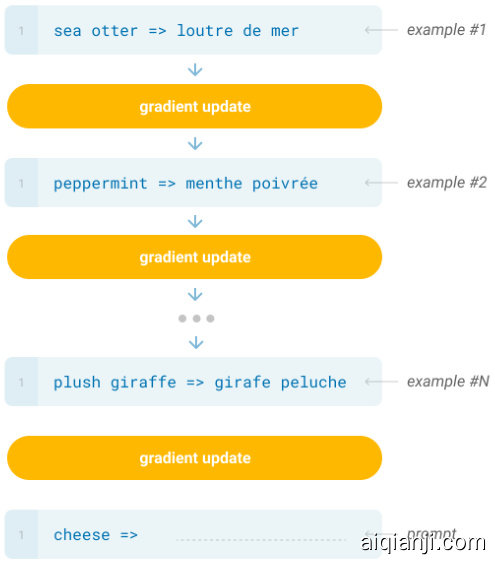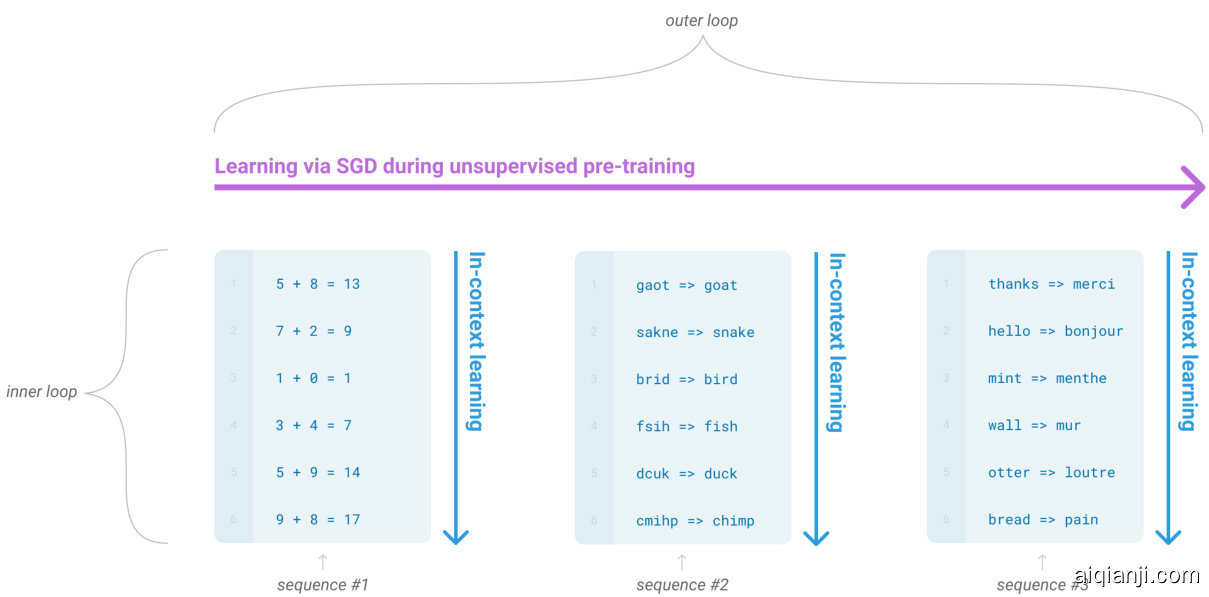Figure 1.1: Language model meta-learning. During unsupervised pre-training, a language model develops a broad set of skills and pattern recognition abilities. It then uses these abilities at inference time to rapidly adapt to or recognize the desired task. We use the term “in-context learning” to describe the inner loop of this process, which occurs within the forward-pass upon each sequence. The sequences in this diagram are not intended to be representative of the data a model would see during pre-training, but are intended to show that there are sometimes repeated sub-tasks embedded within a single sequence.