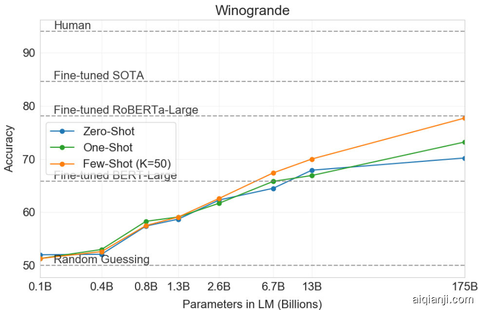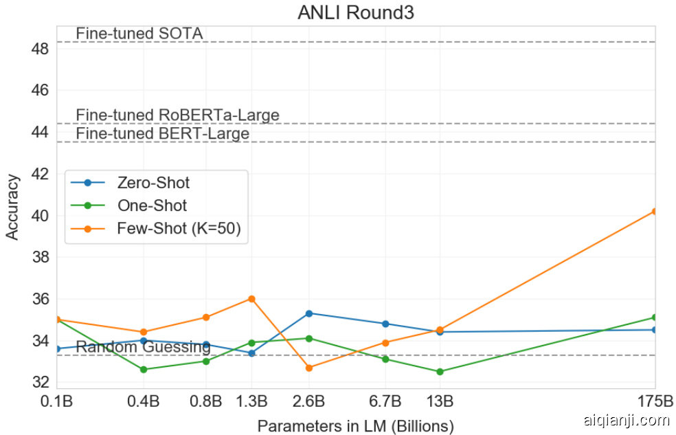 与此同时,我们也发现某些任务即使对于GPT-3这种规模的模型,少样本学习表现仍不理想。这包括ANLI数据集等自然语言推理任务,以及RACE或QuAC等部分阅读理解数据集。通过全面展示GPT-3的优势与局限(包括这些不足之处),我们希望推动大语言模型中少样本学习的研究,并明确亟待突破的方向。