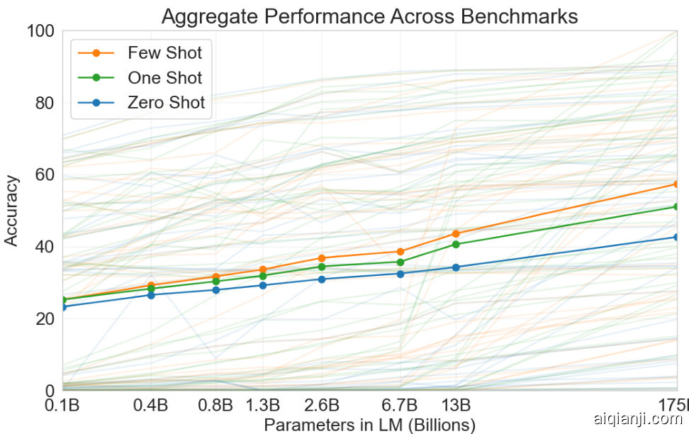 Figure 1.3: Aggregate performance for all 42 accuracy-denominated benchmarks While zero-shot performance improves steadily with model size, few-shot performance increases more rapidly, demonstrating that larger models are more proficient at in-context learning. See Figure 3.8 for a more detailed analysis on SuperGLUE, a standard NLP benchmark suite.