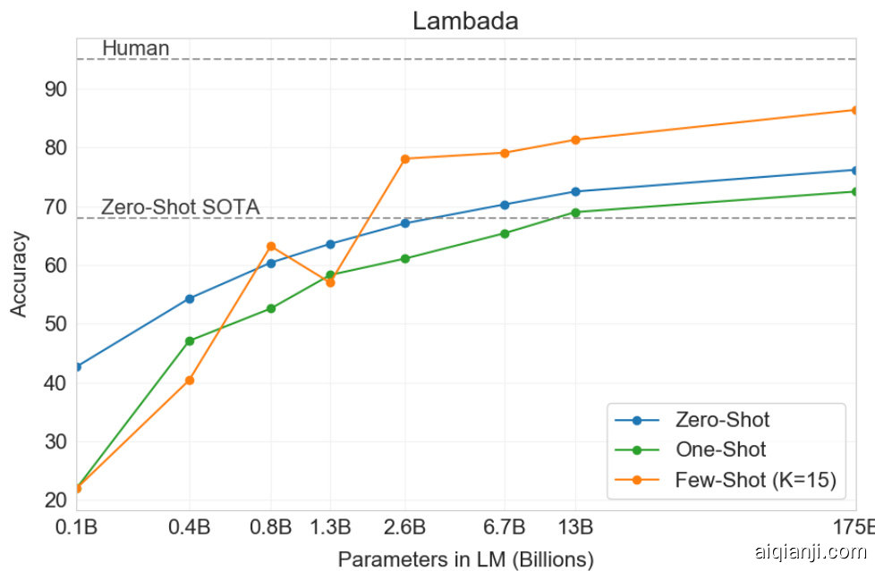 除了上述所有内容外,我们还训练了一系列较小的模型(参数范围从1.25亿到130亿),以便在零样本、单样本和少样本设置下与GPT-3进行性能比较。总体而言,对于大多数任务,我们发现这三种设置下模型容量的扩展相对平滑;一个显著的模式是,零样本、单样本和少样本性能之间的差距通常随着模型容量的增加而扩大,这可能表明较大的模型是更熟练的元学习器。