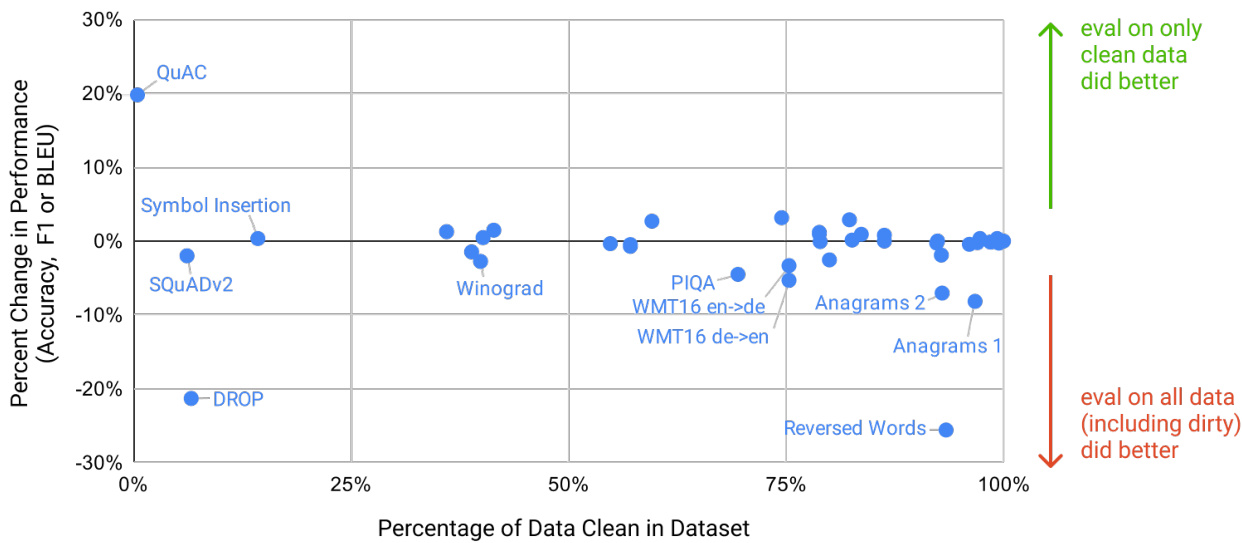 我们还系统研究了"数据污染(data contamination)"问题——这是在高容量模型训练(如使用Common Crawl数据集时)日益严重的问题,由于测试集内容常存在于网络,训练数据可能混入测试集内容。本文开发了系统化工具来测量数据污染并量化其干扰效应。虽然发现数据污染对GPT-3在多数数据集上性能影响甚微,但仍识别出少数可能夸大结果的数据集,我们根据严重程度选择不报告这些数据集结果或使用星号标注。