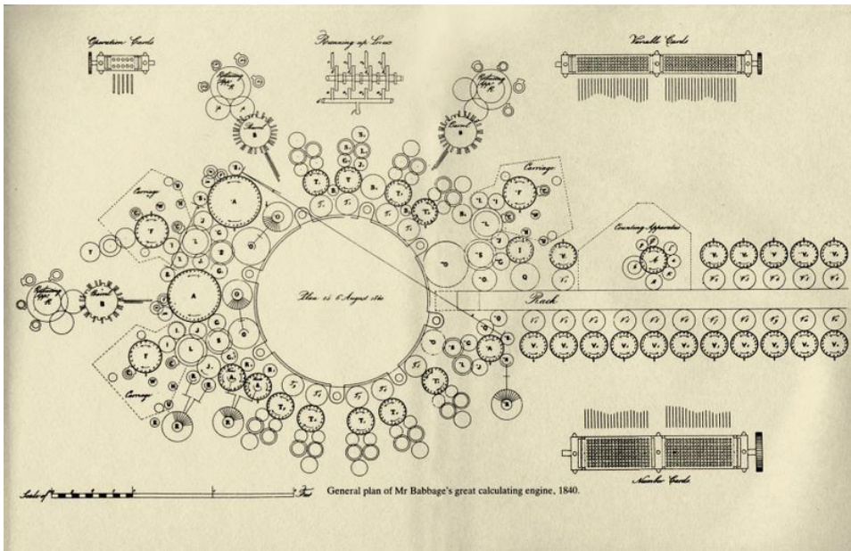 Figure 3: The analytical engine designed by Charles Babbage was never built in part because he had difficulty fabricating parts with the correct precision. This image depicts the general plan of the analytical machine in 1840.