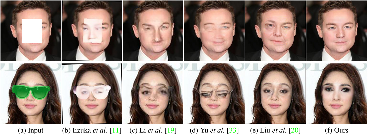 However, face completion is not a simple application of image inpainting, and remains not well solved. Fig. 1 illustrates the results by state-of-the-art CNN-based methods, including Iizuka et al. [11], Li et al. [19], Yu et al. [33], and Liu et al. [20]. Because face images are generally of nonrepetitive structures, blurry results remain inevitable in the methods [11, 19, 33] based on auto-encoder and contextual attention. Furthermore, from the top image in Fig. 1(e), although the generated right eye by [20] is locally satisfying, it is globally inconsistent with the left eye.