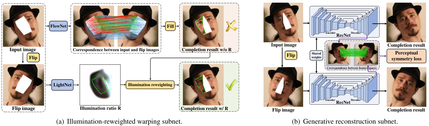 Face completion aims at learning a mapping from occluded face $I^{o}$ as well as its binary indicator mask $M$ to a desired completion result $\hat{I}$ (i.e., an estimation of the ground-truth $I$ ). Here, the images $I^{o}$ , $M$ , and $\hat{I}$ are of the same size $h\times w$ , and $M(i,j)=0$ indicates the pixel at $(i,j)$ is missing. To exploit face symmetry, we present our twostage SymmFCNet to generate symmetry-consistent completion result. In the first stage, an illumination-reweighted warping subnet is deployed to fill in missing pixels happened on only one of the half-faces (see Fig. 2(a)), where a FlowNet is included to establish the correspondence between two half-faces. In the second stage, a generative reconstruction subnet is used to handle missing pixels happened on both of the half-faces and further refine the inpainting result (see Fig. 2(b)). Using the output of FlowNet, we define a perceptual symmetry loss on the decoder feature layer to enforce symmetry consistent completion. In this section, we first detail the architecture of SymmFCNet and then define the learning objective.