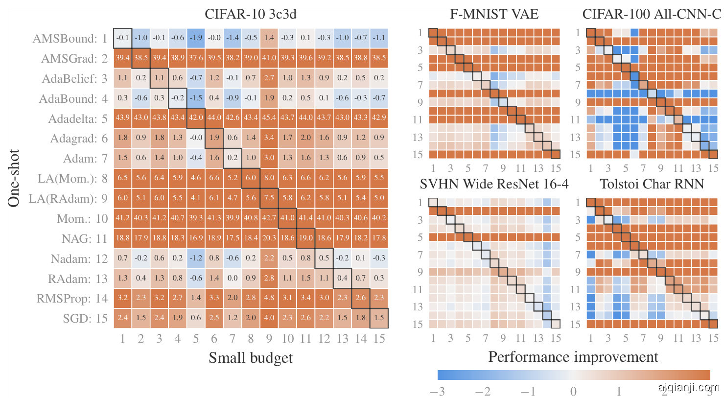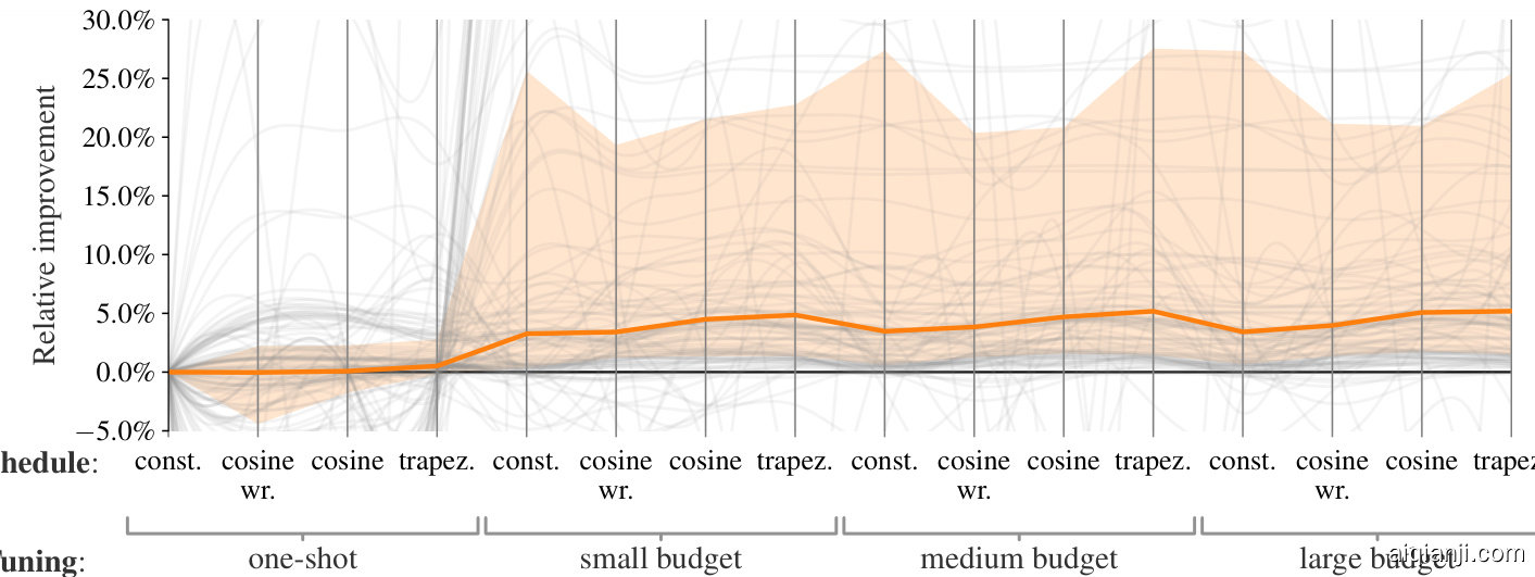 - 来自超过50,000次优化运行的洞察。我们的实验表明,优化器的性能高度依赖于具体问题 (见图4),但仍可总结出一些高层规律:(1) 用默认超参数评估多个优化器的效果,与为固定优化器调整超参数的效果相当。(2) 额外使用未经调优的学习率调度器平均能带来提升,但其效果因优化器和问题差异显著。(3) 虽然没有任何优化器在所有测试任务中占据绝对优势,但我们测试的部分方法表现出极大的性能波动,另一些则始终保持稳定表现。我们刻意避免推荐单一方案,因为无法在统计置信度下确定明确优胜者。