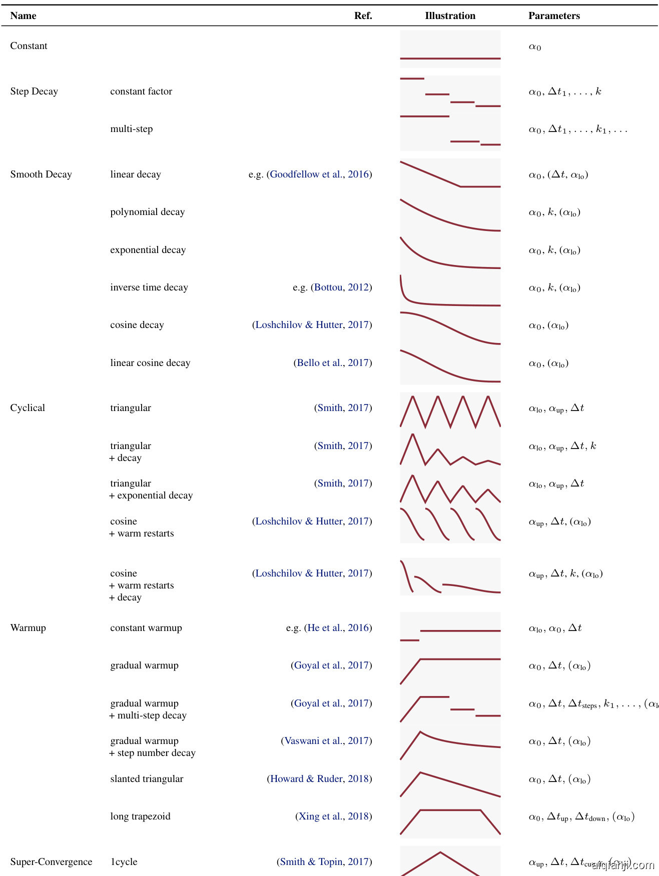 | 优化器 | 参考文献 | 参数 | 默认值 | 调优分布 | 调度 |