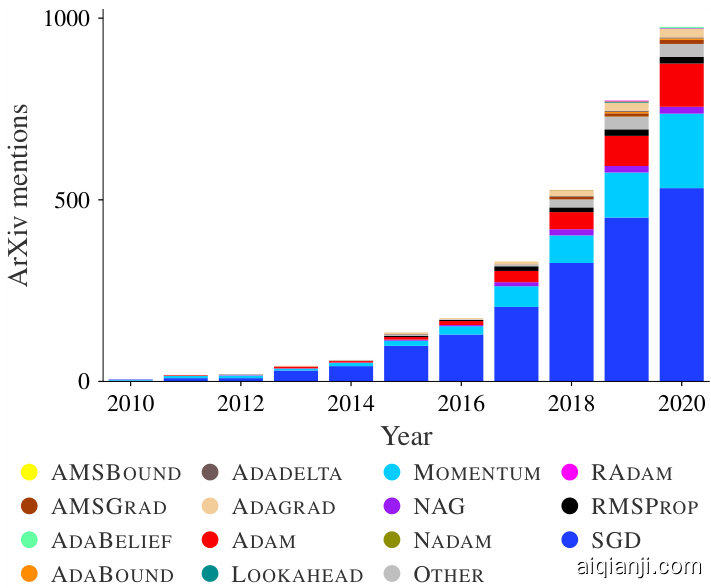 Figure 1: Number of times ArXiv titles and abstracts mention specific optimizer per year. All non-selected optimizers from Table 2 in the appendix are grouped into Other. This figure illustrates not only the expected increase in both methods and mentions, but also that our selection covers the most popular methods. In 2020, the excluded methods accounted for $<4%$ of the mentions (see Figure 9).