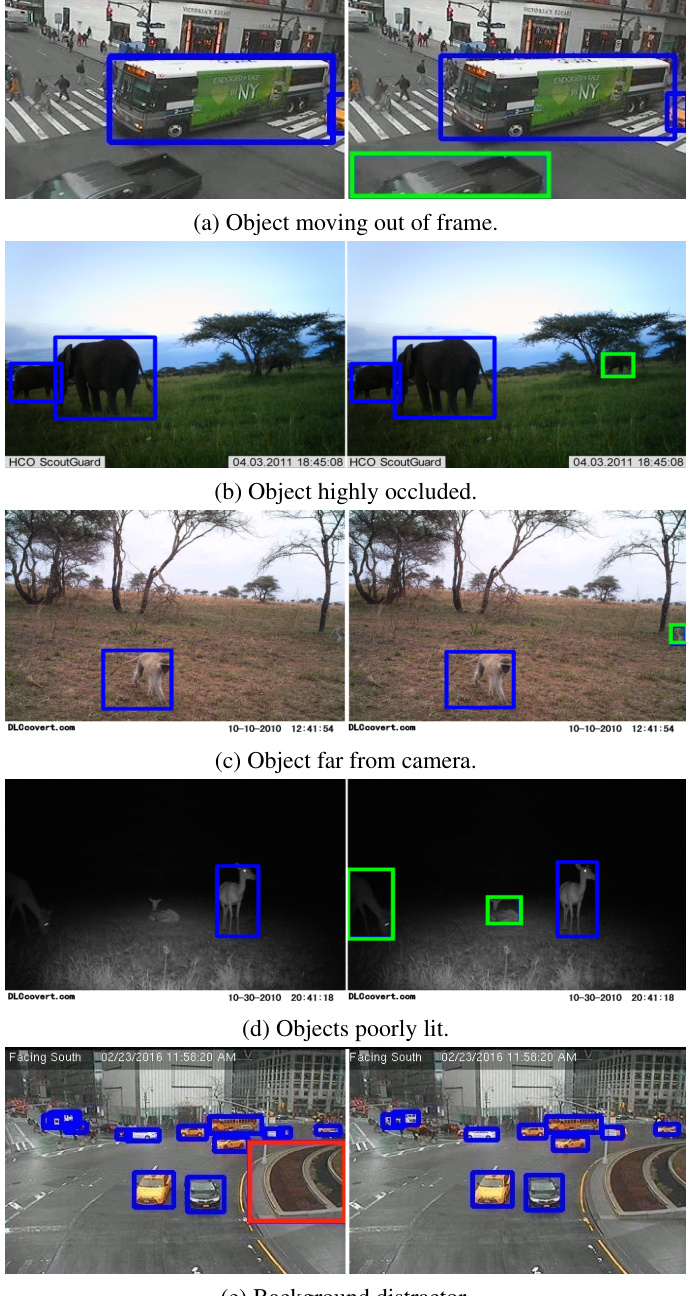 (e) Background distractor. Figure 2: Static Monitoring Camera Challenges. Images taken without a human photographer have no quality guarantees; we highlight challenges which cause mistakes in single-frame systems (left) and are fixed by our model (right). False single-frame detections are in red, detections missed by the single-frame model and corrected by our method are in green, and detections that are correct in both models are in blue. Note that in camera traps, the intra-image context is very powerful due to the group behavior of animal species.