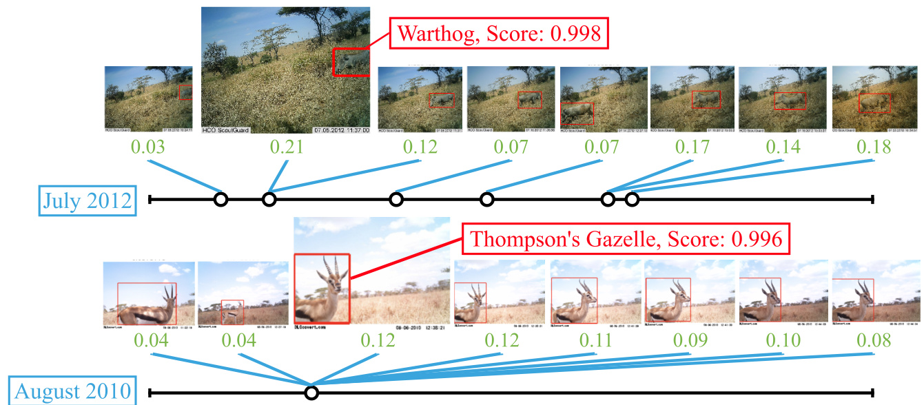 Figure 4: Visualizing attention. In each example, the keyframe is shown at a larger scale, with Context R-CNN’s detection, class, and score shown in red. We consider a time horizon of one month, and show the images and boxes with highest attention weights (shown in green). The model pays attention to objects of the same class, and the distribution of attention across time can be seen in the timelines below each example. A warthogs’ habitual use of a trail causes useful context to be spread out across the month, whereas a stationary gazelle results in the most useful context to be from the same day. The long term attention module is adaptive, choosing to aggregate information from whichever frames in the time horizon are most useful.