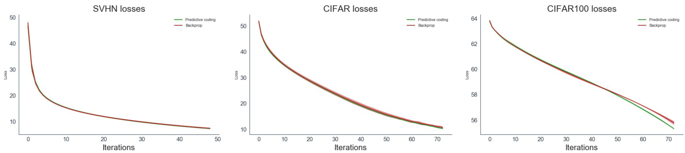 图 4: 在SVHN、CIFAR10和CIFAR10数据集上经过5次随机种子训练的预测编码(Predictive Coding)与反向传播(Backprop)CNN的训练损失曲线。